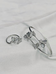 This elegant combo includes a beautifully crafted silver ring and kada, both featuring intricate traditional designs for a perfect matching set.